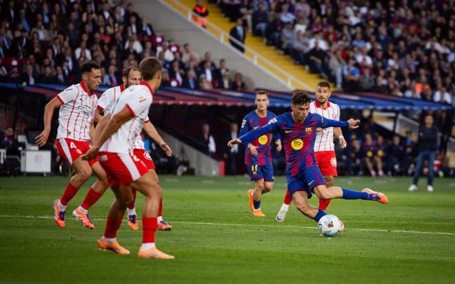 巴萨开场后并未受到太大挑战,吉罗纳退守禁区,巴萨三中场可以在中前场从容连续传递组织进攻,不到10分钟,巴萨已经压到吉罗纳禁区前进行强攻,亚马尔也在右路做出了突破亚历克斯·莫雷诺的人球分过,比赛的进程似乎只等巴萨进球,进球也顺利出现,第13分钟,亚马尔右路传中,佩德里禁区内带球横向拉扯打反角先拔头筹,1比0。