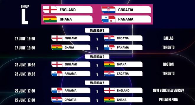 世界杯L组赛程:首战英格兰vs克罗地亚6月18日6时打响